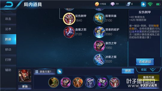 霸者重装具备所有装备中最高的最大生命加成和生命回复效果(脱战后效果更为显著),既能提高红莲斗篷被动的伤害,又能让典韦的续航得到保障。后期在敌方射手和战士出完破甲弓后,对典韦的威胁较大,而反伤刺甲具备极高的物理防御加成,被动-荆棘能将自身所受的物理伤害以法术伤害的形式回敬给对方。