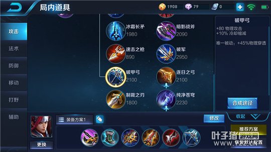泣血之刃的高额物理吸血能让韩信在迂回战中快速回复自身的血量,被敌方打残也能利用兵线和野怪回血。破甲装备的选择上,破甲弓和暗影战斧都是可行的,破甲弓具备百分比物理穿透,而暗影战斧是固定物理穿透,且有一定的冷却缩减加成。