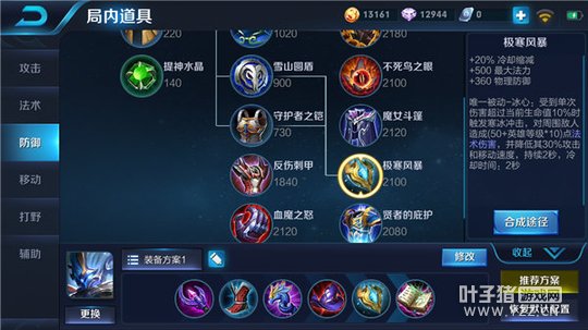 极寒风暴是钟馗唯一一件防御装备,它不仅为钟馗提供了相当可观的防御能力,被动在钟馗受到攻击时能够对范围内的敌人造成伤害和减速效果,十分适合偏近战的钟馗。此外一定比例的冷却缩减配合铭文能够大幅提高钟馗技能的释放频率。
