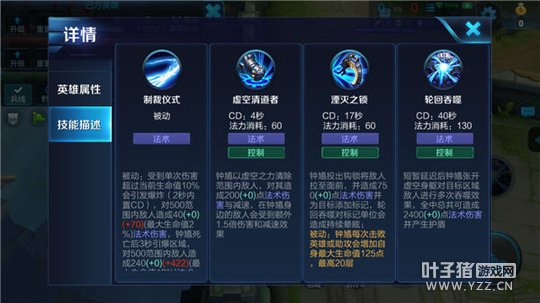 二技能-湮灭之锁:钟馗的核心技能,前期装备尚未成形时该技能多用于骚扰敌方打野,打乱敌方发育节奏,配合队友进行gank。在装备基本成型的中后期,该技能能够打出相当爆炸的伤害,甚至能够起到收割残血脆皮的作用。同时击杀英雄或助攻会叠加钟馗的最大生命值,有上限。