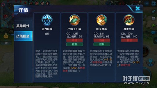 分析:刘禅操控机关熊猫展开双臂旋转,持续对周围的敌人造成伤害。三技能是刘禅的一个AOE输出技能,形态类似于钟无艳的三技能,在技能持续期间内可以通过移动来跟着敌人不停输出。三技能虽然单体输出不高,但是由于是AOE输出,在团战中可以打出非常可观的伤害,三技能最强大的地方体现在刘禅越塔的时候,刘禅在敌方的防御塔下使用三技能,可以配合被动技能的效果,既能对敌方的英雄造成伤害,也能对敌方的防御塔造成伤害,在对敌方防御塔造成伤害的同时还能持续为刘禅回复生命值,极大的提升了刘禅的续航能力,后期刘禅的物理防御和生命值较高时,在敌方的防御塔下使用三技能几乎可以无限扛塔,让队友有足够的时间将敌人击杀或者将防御塔拆掉。