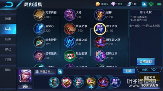 前期高渐离选择抵抗之靴提升法术防御和移动速度,韧性的提升降低高渐离受控制的时间,增强他的生存性。噬神之书是高渐离前期核心装备,增强法术攻击、血量和移动速度,被动效果法术吸血提升可以增强高渐离的续航性。痛苦面具提升法术攻击和血量,被动效果在技能命中对手时候造成额外的伤害,增强高渐离的输出能力,而法术穿透的提升则让高渐离充分发挥自身输出。辉月提升法术攻击和冷却缩减,主动效果开启在关键时刻起到保命的作用。而博学者之怒大幅度提升法术攻击,让高渐离在后期打出爆发性的输出。虚无法杖提升法术攻击和血量,被动效果大幅度法术穿透的提升让高渐离轻松克制坦克英雄。