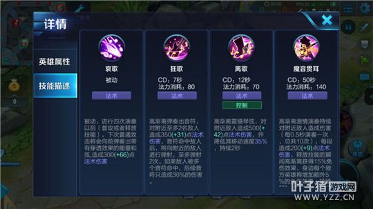 三技能魔音贯耳:大招是高渐离的核心技能,在团战中提升了高渐离的法术伤害和机动性,强大的AOE输出配合上一、二技能在战斗中直接切敌人薄弱的后排,对后排射手和法师来说,大招是梦魇一般的存在,如果配合闪现还能够粘着敌人打。