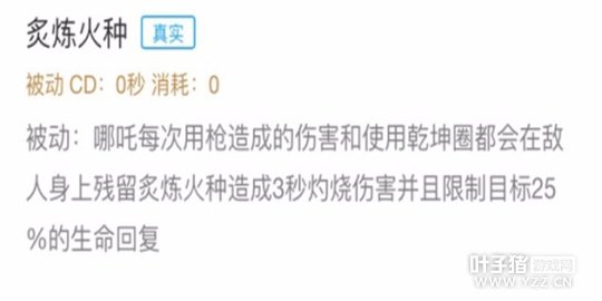 解析:哪吒每次攻击都会造成持续的真实伤害,并造成3秒灼烧伤害并且限制目标25%的生命回复,随着等级和攻击的提升成正比的造成伤害,并且对防御能造成伤害。