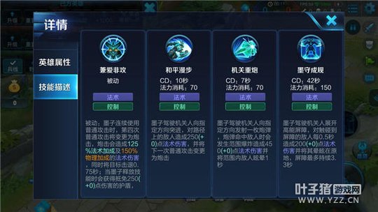 被动-兼爱非攻:墨子连续的第四次普通攻击将会得到强化,可对目标造成击退的同时造成一定的法术伤害。墨子每次释放技能时,都将获得一个抵免伤害的护盾。