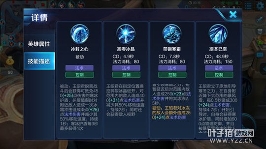 凛冬已至(三技能):王昭君的核心输出技能,伤害高、范围广,释放期间能够有效减速对手并获得高额护甲。有利必有弊,晕眩、击飞、击退、移动都可打断大招施法,一旦释放时机把握不当,且缺乏队友保护的情况下,极易遭到敌军的集火秒杀。
