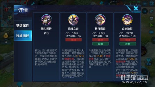 分析:牛魔向指定方向横劈,对范围内的敌人造成伤害并减少敌人的物理攻击和法术攻击,命中敌方英雄会强化下一次普攻,附加额外的伤害。一技能是牛魔的AOE技能,能够对范围内的敌人都造成伤害,附加伤害也让牛魔在一技能命中英雄之后可以造成更高的伤害,除了输出以外,一技能最强大的是可以减少敌人物理攻击和法术攻击的效果,团战时在人群中使用,可以大幅度降低敌人的输出,团战收益非常高,在敌方战士或者刺客接近己方后排的时候,牛魔也可以对他们使用一技能,降低他们的输出,让他们无法秒杀后排。