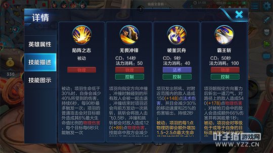 被动-陷阵之志:一个很强大的被动技能,当项羽的生命值低于30%时就会触发被动,被动可以提升项羽的抗伤能力,在残血时可以保证自己安全撤退。其次被动也增强了项羽的普通攻击,附加的伤害让项羽不需要出输出装也能打出很高的伤害,利用好被动,在前期就能建立起不小的对线优势。