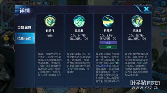 三技能-忘忧曲:可为技能范围内血量最低的队友提供充足加血效果,同时会增加所有范围内队友的防御能力,开团时期队友待在蔡文姬的圈内可增加一定对战优势,提升获胜几率。