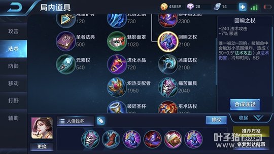 分析:回响之杖大幅提升法术攻击和移速,被动效果让技能附带额外的范围伤害,提升了武则天的输出能力和机动性。移速的提升配合武则天的被动让其在团战中更加灵活,可以进退自如的与敌人拉扯消耗。第四件博学者之怒,进一步提升武则天的法术攻击,使其输出伤害爆表。