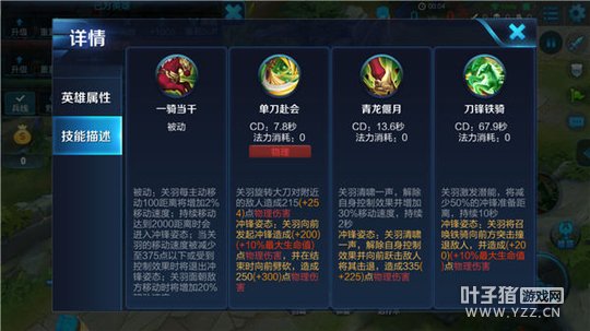 被动-一骑当千:关羽每主动移动一段距离,都会提升自身移速,若关羽在面朝敌方移动时,会提升大量的移速,并在持续移动到达一定距离时,将进入冲锋姿态,若关羽受到控制或速度降低,将立即退出冲锋姿态。冲锋姿态:关羽的普攻会击退敌人并附带额外的物理伤害。