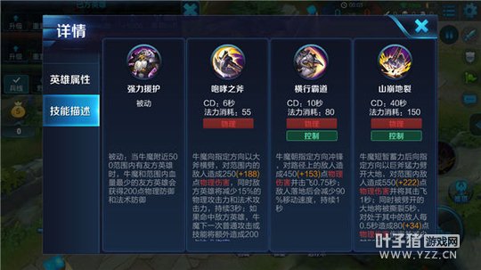 一技能-咆哮之斧:牛魔挥斧横批面前区域,对命中的敌人造成伤害和虚弱效果;如果命中了敌方英雄,则牛魔的后续一次普攻或技能将附带额外法术伤害。