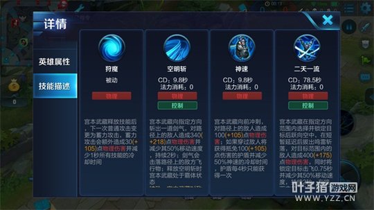 解析:宫本武藏的大招有极好的突进和控制效果,在飞起状态下的宫本武藏无视所有伤害效果,二刀流状态的伤害加成极高。移速减益能让宫本武藏更好的黏人输出,二刀流状态下技能和普攻都会有额外伤害加成,再加上被动技能的增益效果可以瞬间打出爆炸伤害。