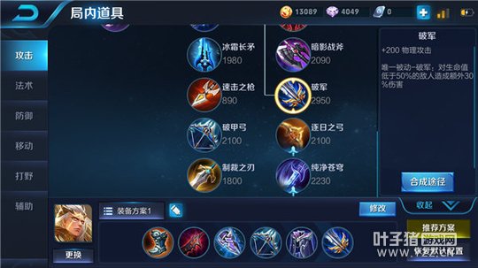 这时后羿自身的坦度已经足够,但输出能力略显不足,因此购买破军将后羿的输出能力最大化的提升。破军为后羿提供了大量的物理攻击力加成,搭配中期装备破甲弓,使得后羿即使在面对敌方坦克英雄时依旧能够迅速的解决。且破军的被动效果赋予了后羿在面对残血英雄时额外的输出能力。