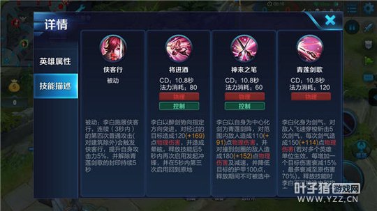 李白是王者峡谷中非常受欢迎的英雄,各个段位的出场率都非常的高,以其特殊的玩法,让他在刺客英雄中地位非常高。一技能用来打伤害的同时,还有位移效果,可进可退,牵扯能力非常强;二技能和三技能在释放期间不能被选中,这更是增加了其生存能力,让他在对战中能秀翻对手。另外,与其他刺客不同的是,李白的持续作战能力一般,在对战中应尽量避免与敌人持久作战,以迂回战术为主,打完一波大招后迅速撤退,消耗的同时还能扰乱敌人的节奏。下面给大家详细介绍下李白该怎么玩。