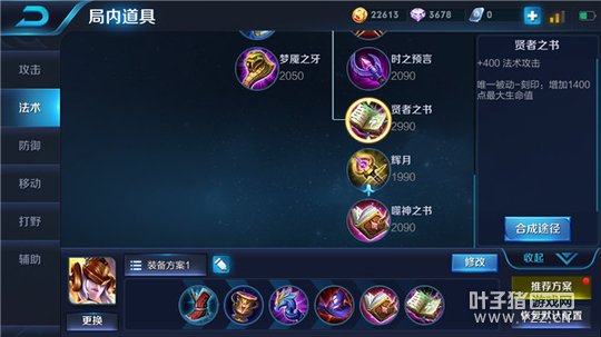 噬神之书主要增强女娲的续航能力,增强女娲的法术攻击力的同时提升法术吸血,依靠其后期极为可观的输出能力,可以源源不断地吸收回复自身生命值。在团战前期不断的消耗敌方英雄时,弥补自身所受的伤害。贤者之书将女娲的法术攻击力最大化的提升,配合游戏中期的装备博学者之怒,将女娲的输出能力最大化的发挥,利用四技能可对敌方英雄造成贯穿性的高额法术伤害。配合短暂的技能冷却时间,可在后期团战中不断释放,收割能力发挥至极致。同时贤者之书给予了女娲额外的最大生命值加成,加强了其生存能力,避免被敌方英雄在后期团战中乘虚而入。