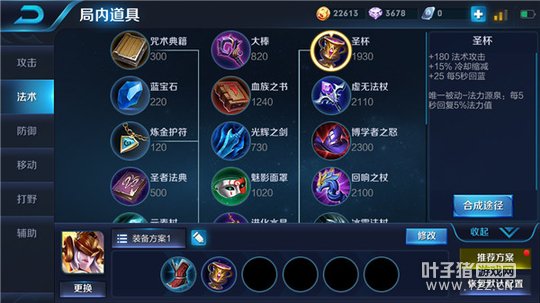 解析:鞋子在游戏的前期其性价比是很高的,对于任何一名英雄都适用。女娲自身对于冷却缩减能力的需求远大于法术攻击力的提升,她需要不断的释放技能干扰敌方英雄才能将其控场能力最大化的发挥出来。冷静之靴主要提升女娲的冷却缩减能力,加快其技能释放的频率,同时移动速度的加成进一步提升女娲的支援能力以及机动性。圣杯主要提升女娲的法术攻击力以及冷却缩减能力,与冷静之靴的搭配同时附加铭文的增益效果,可以使女娲在前期就将技能的冷却时间最大化的缩减,对于前中期小规模的团战有很大的帮助,也进一步加强了女娲的收割能力。同时女娲自身对于法力值的需求较大,蓝耗较为严重,这一点在游戏的前期较为明显,极大地限制了女娲的输出能力。而圣杯的被动技能则很好的解决了这个问题,每隔一段时间回复女娲一定量的法力值,加强了女娲的续航能力,减少其回城的次数,逐渐的拉开与敌方英雄的经济差距。