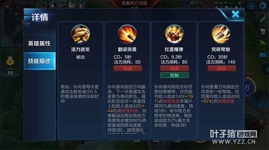 一技能-翻滚突袭:朝指定方向翻滚,强化下一次普攻,可以对一条直线上的敌人造成高额的物理伤害。作为孙尚香的位移技能和输出技能,能不能用好一技能是玩好孙尚香的关键,大家在使用一技能的时候尽量不要前后翻滚,最好能够左右翻滚,这样可以保证自己永远处于一个安全的位置。值得一提的是,如果翻滚时附近有敌人的话,孙尚香将会获得一个移速buff的加成,这个特性可以用来侦查草丛中是否有敌人的埋伏。