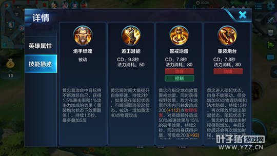 黄忠增加移速,持续数秒,重装炮台状态下释放会立刻取消架起状态。一技能多用来追击和逃命,配合二技能可以很好的风筝敌人,增加了自己的生存能力。另外,技能被动会增加额外的攻击力,因此可以主加一技能。