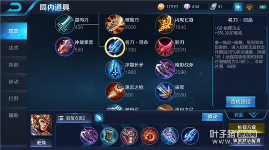 解析:暗影战斧是现版本最适合战士且性价比较高的装备,适合前期经济增长较慢的杨戬使用。抵抗之靴搭配杨戬的被动技能,可使杨戬受到的控制时间大幅度减少,灵活性更上一层楼。杨戬对线的主要敌人便是射手,使用装备反伤刺甲也加强对其抵抗能力。不死鸟之眼可提高杨戬大招恢复的生命值,进而强化杨戬的反杀能力。冰痕之握是杨戬切后排时使用的主要装备,可有效的防止敌军后排逃脱。名刀司命则是后期杨戬保命时的重要装备,因为贤者的庇护经过改版,早已不适合杨戬这种切后排类型的英雄,而名刀·司命则能强行为杨戬提供一段无敌时间,简化切后排难度。