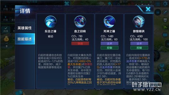 被动-反击之镰:白起的技能或普攻在命中敌人后,会减少其对白起造成的伤害(等级越高减伤效果越好)。