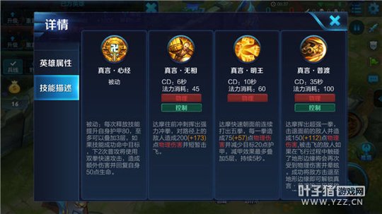被动-真言·心经:达摩每次释放技能都会提高自身的双抗,如果命中目标,达摩后续的两次普攻速度会加快并能在命中敌人后回复自身生命值。
