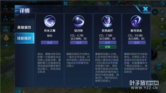 大招-新月突击:露娜向指定位置发起突击,对路径上的敌人造成法术伤害,若露娜命中被标记的敌人,将会刷新该技能的冷却时间。