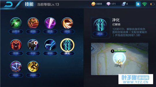 分析:关羽需要不断地移动使自己保持在冲锋姿态下,一旦在受到减速或控制效果时,将退出冲锋姿态,净化能解除自身所有负面和控制效果,在关键时刻使用,能将关羽的输出最大化。
