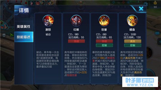 一技能——红眼:一技能是典韦的加速和解控技能,增强了典韦的战场存活和追击能力。