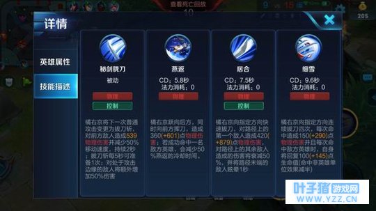 细雪:橘右京的三技能使用后能够朝指定方向连续拔刀多次,每次都能造成一定的物理伤害,且每次命中敌军后自身都能回复一定的生命值。三技能具有较好的输出能力,适合用来击杀残血英雄。