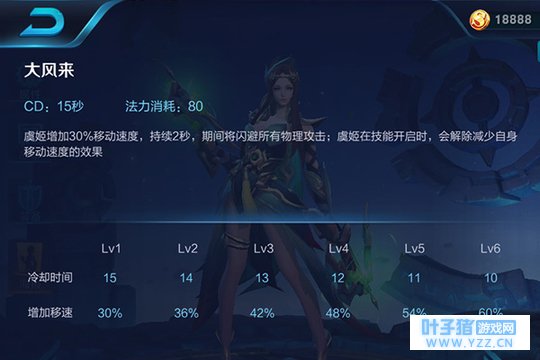 二技能:大风来,虞姬增加移动速度,持续期间将闪避所有物理攻击;虞姬在技能开启时,会解除减少自身移动速度的效果。