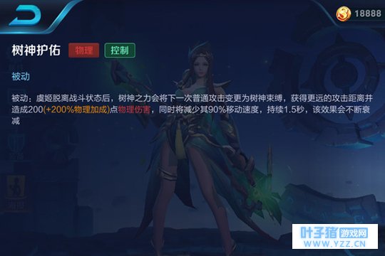 被动:树神护佑,虞姬脱离战斗状态后,树神之力会将下一次普通攻击变更为树神束缚,获得更远的攻击距离并造成物理伤害,同时减少其移动速度,该效果会不断衰减。