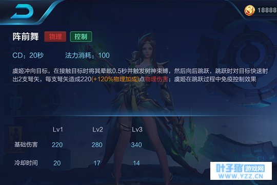 三技能:阵前舞,虞姬冲向目标,在接触目标时将其眩晕并触发树神束缚,然后向后跳跃,跳跃时对目标快速射出弩矢,每支弩矢造成大量物理伤害;虞姬在跳跃过程中免疫控制效果。