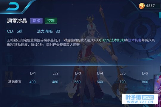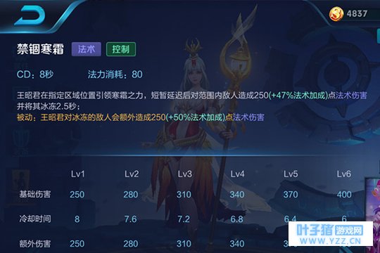 二技能:禁锢寒霜,王昭君在指定区域引领寒霜之力,短暂延迟后将范围内敌人并造成法术伤害并将其冰冻,被动:王昭君对冰冻的敌人会额外造成法术伤害。