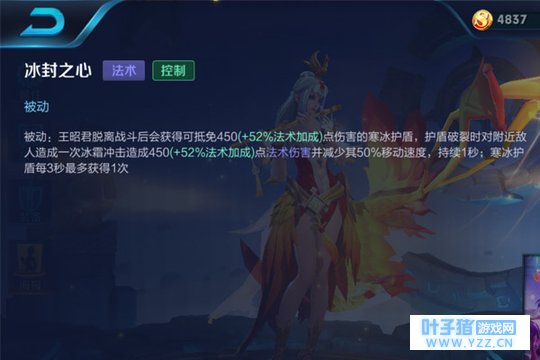被动技能:冰封之心,王昭君脱离战斗后会获得可抵免伤害的寒冰护盾,护盾破裂时对附近敌人造成一次冰霜冲击造成较高法术伤害并减少其移动速度。
