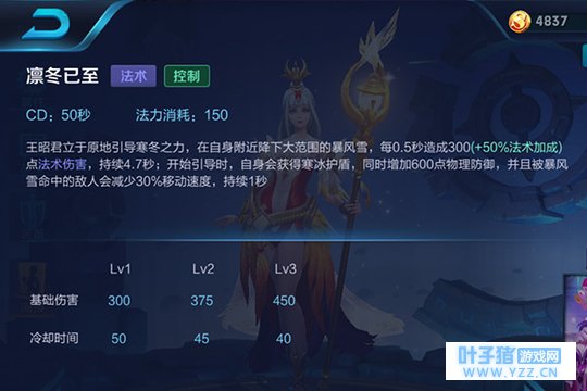 三技能:凛冬已至,王昭君立于原地引导寒冬之力,在自身附近降下大范围的暴风雪,持续造成较高法术伤害;开始引导时,自身会获得寒冰护盾,同时增加物理防御,并且被暴风雪命中的敌人会减少移动速度。