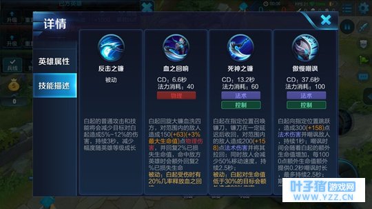 血之回响:白起回旋大镰血洗四方,对范围内敌人造成物理伤害,并附带最大生命值百分比物理伤害,命中敌人后会回复自身以损生命值百分比血量,命中英雄会额外回复生命值。这是白起战斗的核心技能,无止境的回血,让白起屹立不倒。