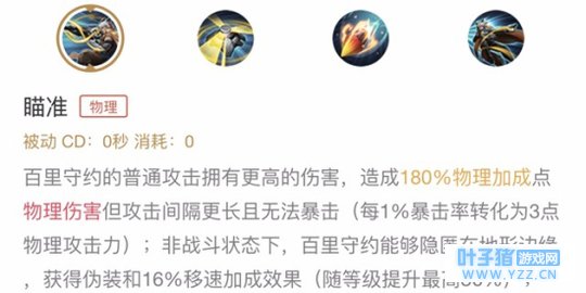 实战解析:百里守约的普攻相较于其他英雄来说会造成更高的伤害,但无法暴击且攻速较慢,这并不代表攻速对百里守约没用,相反的,适当的出一些攻速装能够使得百里守约的普攻更具有威慑力。暴击率会转换为一定的攻击力,但是在实战中并没有必要特意去出暴击装。脱战后百里守约在贴近墙壁或防御塔等地形时会获得类似鬼谷子的隐身效果以及随等级提升的移速加成,这能使得百里守约的支援速度和上线速度大大提升,有时在逃跑的时候也能起到奇效。