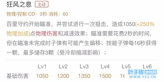 实战解析:二技能是百里守约的主要输出手段,也是百里守约伤害最高的技能,超长的技能射程使得百里守约能够从很远处攻击到敌人,一个射手能够与敌人拉开超远的距离,保证自身安全的同时还能进行输出,这样的一个英雄能不强吗?二技能需要两秒的时间进行瞄准,瞄准时间结束之前开枪百里守约的子弹可能会发生偏移,所以除非敌人已经贴脸,否则最好不要提前开枪。