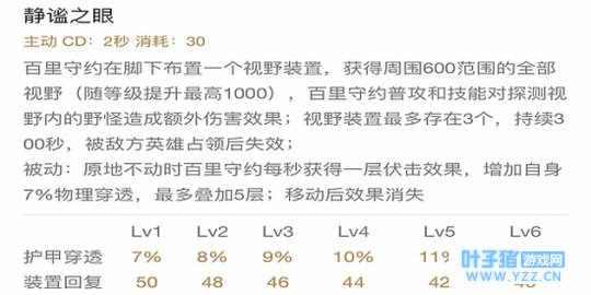实战解析:一技能在经历一次削弱后对前期的帮助小了很多,也使得守约在前期收敛了许多。但在后期的时候可以将一技能放在关键点上,能够对整个战局起到关键作用,并且后期守约的伤害是不容小觑的,敌人在解除百里守约一技能视野的时候守约有两秒的时间去击中敌人,后期一枪,不死也残。一技能的被动效果更是增强了百里守约对敌方护甲穿透的效果,能够打出更高的伤害,但在实战中不需要玩家刻意的去累积一技能的被动效果。