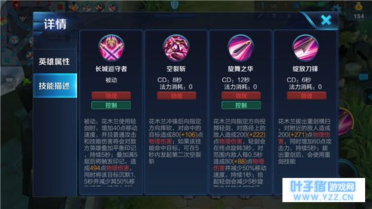被动技能——长城巡守者:被动技能使的双剑形态的下的花木兰更加灵活,并可通过触发印记,沉默并减速敌人,增加击杀率;而在重剑形态下,花木兰具有更高的战场生存能力。