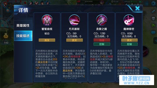 被动-饕餮血统:被动让吕布拥有比其他近战英雄更远的攻击距离,这让吕布在攻击一些远程英雄时相比其他近战英雄更占优势,其次在方天画戟附魔状态下,吕布的普攻是可以回复生命值的,利用这一点,吕布的持续作战能力还是很强的。