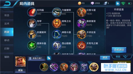 解析:到了后期,苏烈不仅要作为先手开团,还要承担前排肉盾的职责。魔女斗篷增加法术防御和最大生命的同时,被动-迷雾提供一个吸收法术伤害的护盾,能很好的抵御敌方法师英雄的输出。不祥征兆增加物理防御和最大生命,被动-寒铁更是能很好限制敌方输出,加强苏烈前排的坦度。