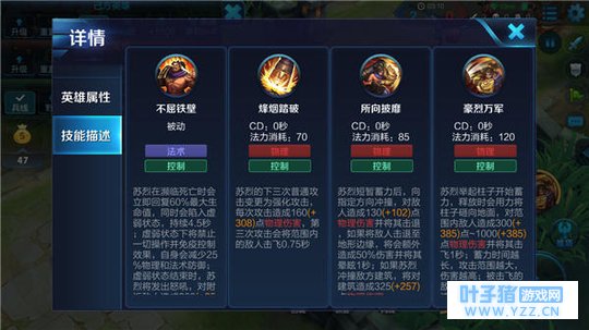 三技能-豪烈万军:苏烈举起柱子进行蓄力,蓄力后释放,对范围内的敌人造成物理伤害,并且将其击飞。攻击范围,伤害皆与蓄力时间成正比。被击飞的敌人在落地后,仍会产生一次震荡攻击,对附近的敌人额外造成物理伤害。蓄力期间可以移动,取消时会返还大部分技能冷却。被动:苏烈释放技能攻击,或者强化攻击时将对附近敌人造成持续的法术伤害。