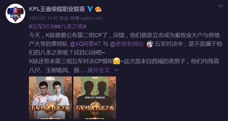 继八杀之夜第一对CP喵汪组合揭晓,现在KPL王者荣耀职业联赛也在官博上公布了第二组CP: