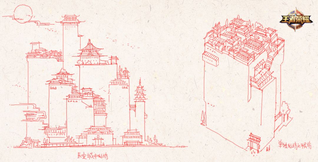 上去做设计,拉开与真实长安的差距,让王者的长安看上去更加的高大与幻想。
