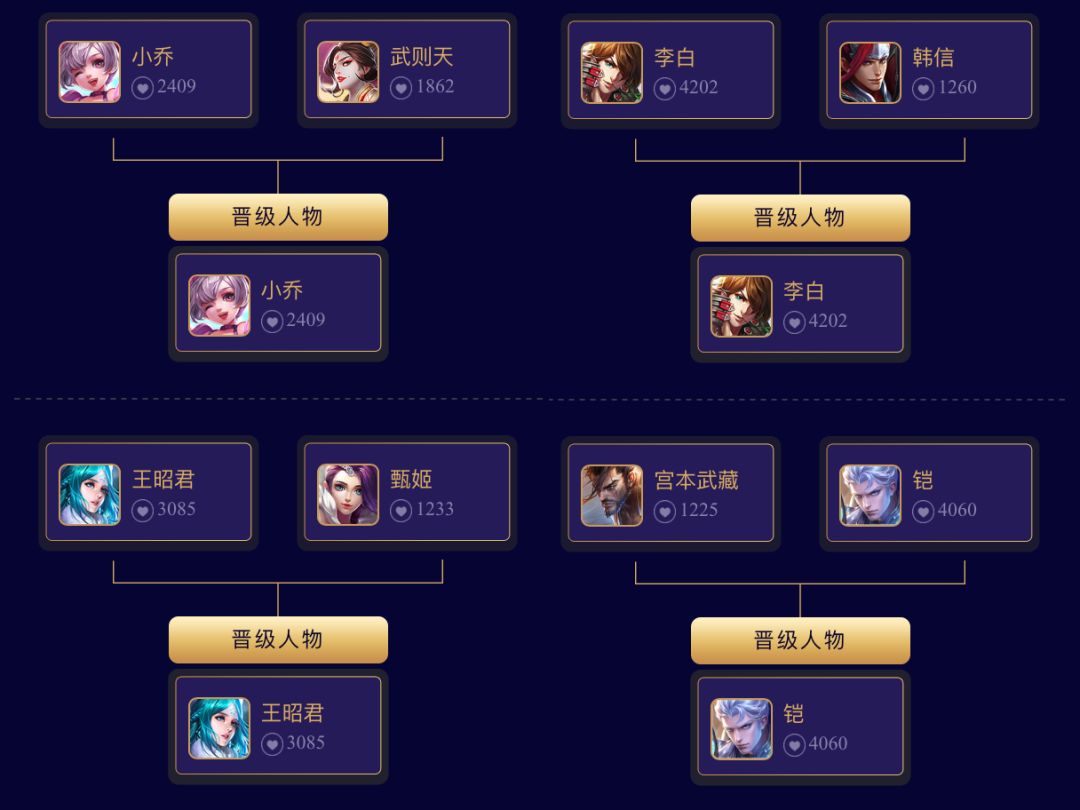 据最新情报显示, 李白 、 铠 、 小乔 、 王昭君 成功晋级下一轮淘汰赛(胜出的4位英雄有3个都站在左边哦)!于是坊间就出现了一个 最左传说 。