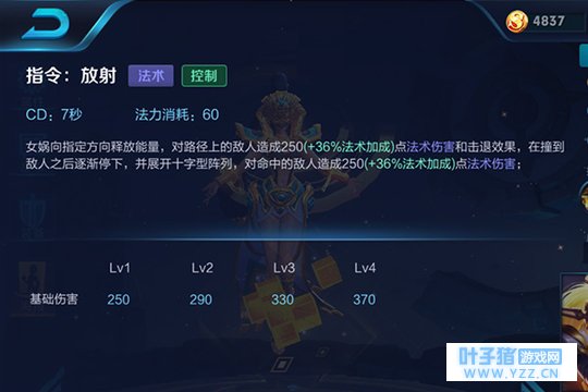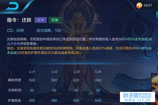 解析:作为女娲的大招,四技能是全地图打击技能,这样残血英雄只要落入女娲眼中,都将逃不脱一血被拿的命运哟!后期,女娲四技能将直接对敌方后排进行打击!