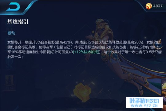 被动技能:辉煌指引,女娲每升一级提升一定自身视野,同时提升普攻与技能释放范围;女娲的技能伤害会标记英雄,使得友军(包括自己)对标记目标造成的普攻和技能伤害,能够在短时间内增加友军移动速度和生命回复。