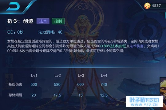 二技能:创造,女娲在指定位置创造矩阵空间,阻止敌方单位通过;创造的空间将在一定时间后消失,空间消失或者女娲其他技能触碰到矩阵空间都会引发爆炸对附近的敌人造成法术伤害;